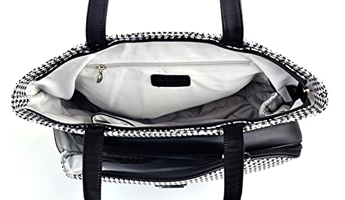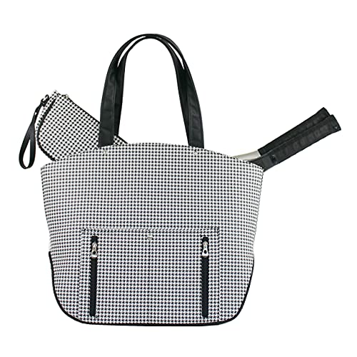 Includes a matching cosmetic case and decorative tassel. Saffiano faux leather with Houndstooth pattern. Separate compartment fits two (2) standard size tennis racquets or Pickleball paddles. Large interior with pockets for water bottle, cell phone, and other small items. More pockets on back. Dual handle straps with a 10″ drop. Metal feet for extra protection. Matching color stripe lining. Fully lined and padded. Measures: 20” x 15” x 6”. Weigh: 3 lb. 8 oz. Please feel free to contact seller for questions regarding this item.