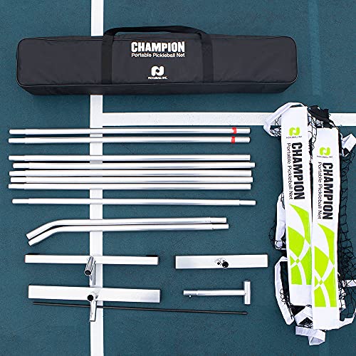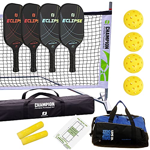 Champion Portable Pickleball Net Set with Eclipse Paddles (4 Graphite Paddles (1 Each Color), 4 Pickleballs, 2 Line Chalk, Rules/Strategy Guide, Duffel)