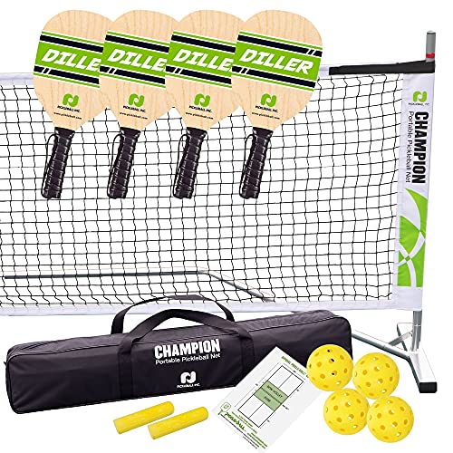 Champion Portable Pickleball Net Set with Family Friendly Beginner Diller Paddles (4 Wood Paddles, 4 Pickleballs, 2 Line Chalk, Rules/Strategy Guide)