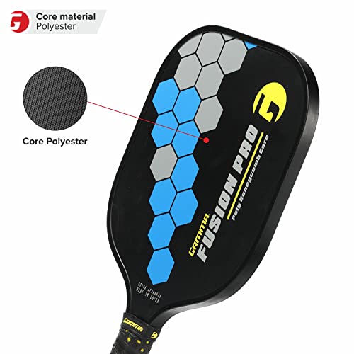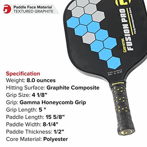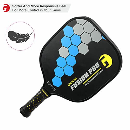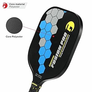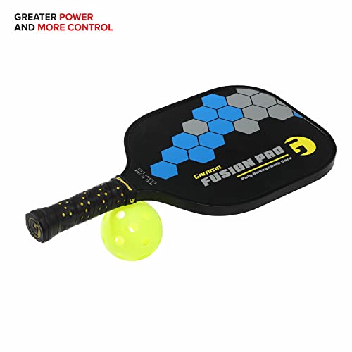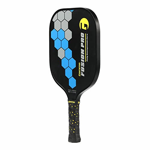 The FUSION Pro paddle is designed with a poly honeycomb core and a textured graphite hitting surface for superior feel and more control. Signature GAMMA Honeycomb Cushion Grip provides superior comfort during play. An excellent choice for players of all levels. Approved by the USAPA.