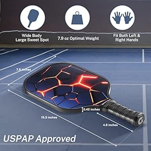 【Lightweight & Quietness】Only 7.9 ounces per pickleball paddle, this lightweight pulp makes it easy to switch between forehand and backhand for all ages, beginners or pro players. Also, the polymer honeycomb core does a great job of reducing the thumping sound for all indoor or outdoor play.