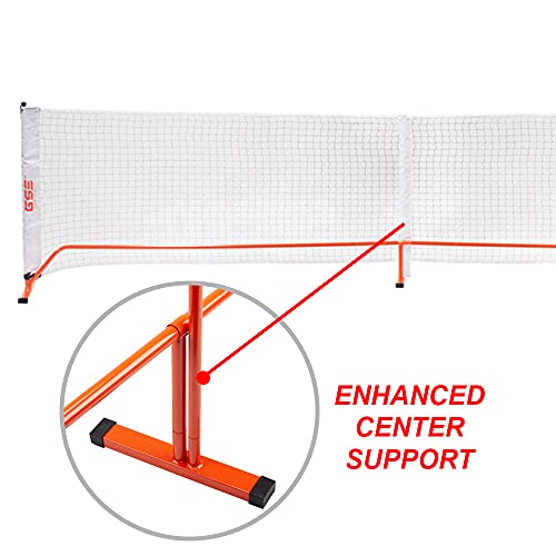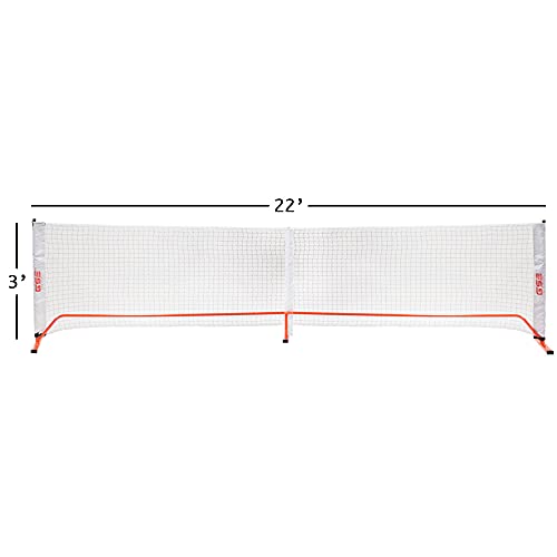 3′ x 22′ official size pickleball net with reinforced tape and tension straps, for reinforcement and preventing snapping. Set of heavy-duty black powder coated steel support poles with flat steel legs to improve stability. The center position has a raised pole to ensure that the entire net remains parallel. Very easy to assemble and disassemble in minutes. Made with durable construction.
