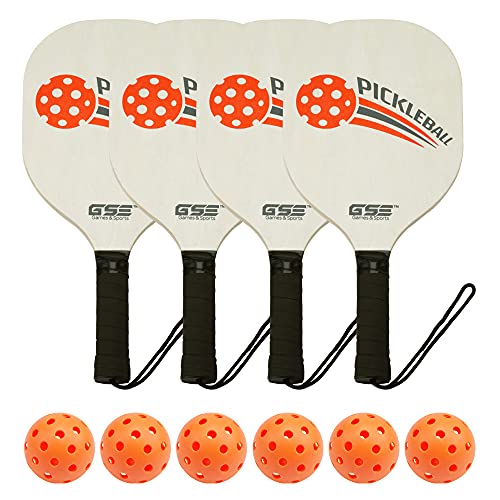 Four standard size premium hardwood pickleball paddles have a cushion grip and wrist strap. Dimensions: 8″ x 9″ face, with a 5″ handle.