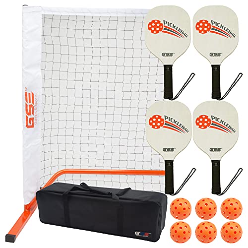 The complete set includes a pickleball net, steel support pole frame, 4 hard wood pickleball paddles, 6 official outdoor pickleballs, a heavy-duty nylon carrying bag, and assembly and rules instructions.
